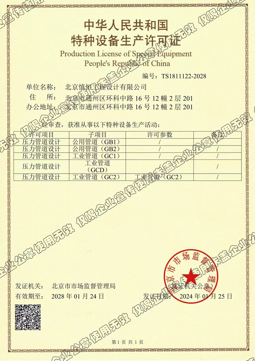 熱烈祝賀!我公司經(jīng)過長期不懈的努力,于2024年11月壓力管道成功增項,正式取得北京市市場監(jiān)督管理局頒發(fā)的《壓力管道設(shè)計許可證資質(zhì)》,包含公用管道(GB1\GB2)、工業(yè)管道(GC1\GC2\GCD),標(biāo)志著公司拓寬了壓力管道相關(guān)設(shè)計的業(yè)務(wù)領(lǐng)域,為助推公司業(yè)務(wù)發(fā)展增添一份力量!